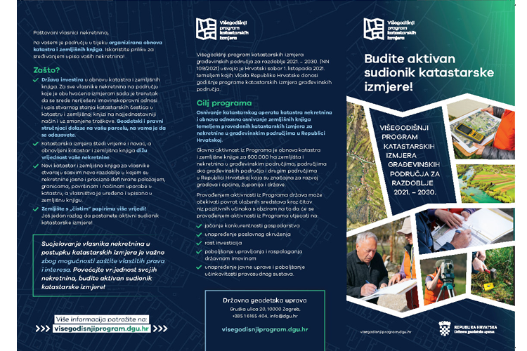 Hrvatski sabor je dana 1. listopada 2021. godine donio Višegodišnji program katastarskih izmjera građevinskih područja za razdoblje 2021. – 2030. Glavna aktivnost iz Programa je obnova katastra i zemljišne knjige za 600.000 ha zemljišta i nekretnina u građevinskim područjima i to u razdoblju od 2021. do 2030.